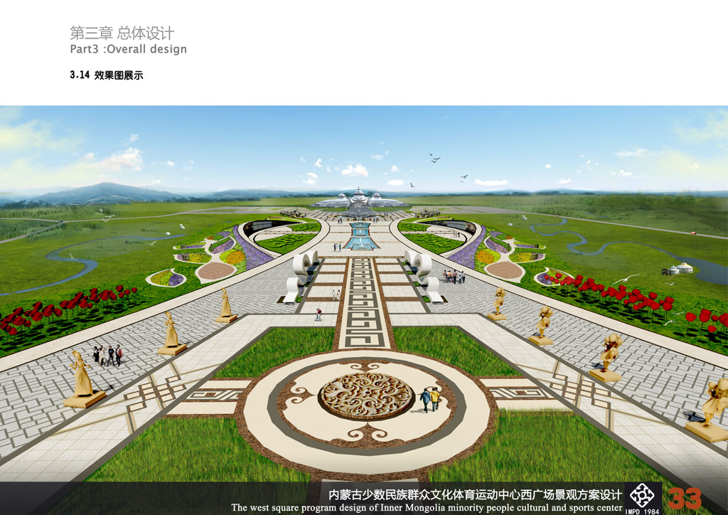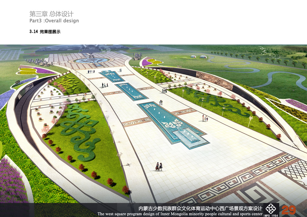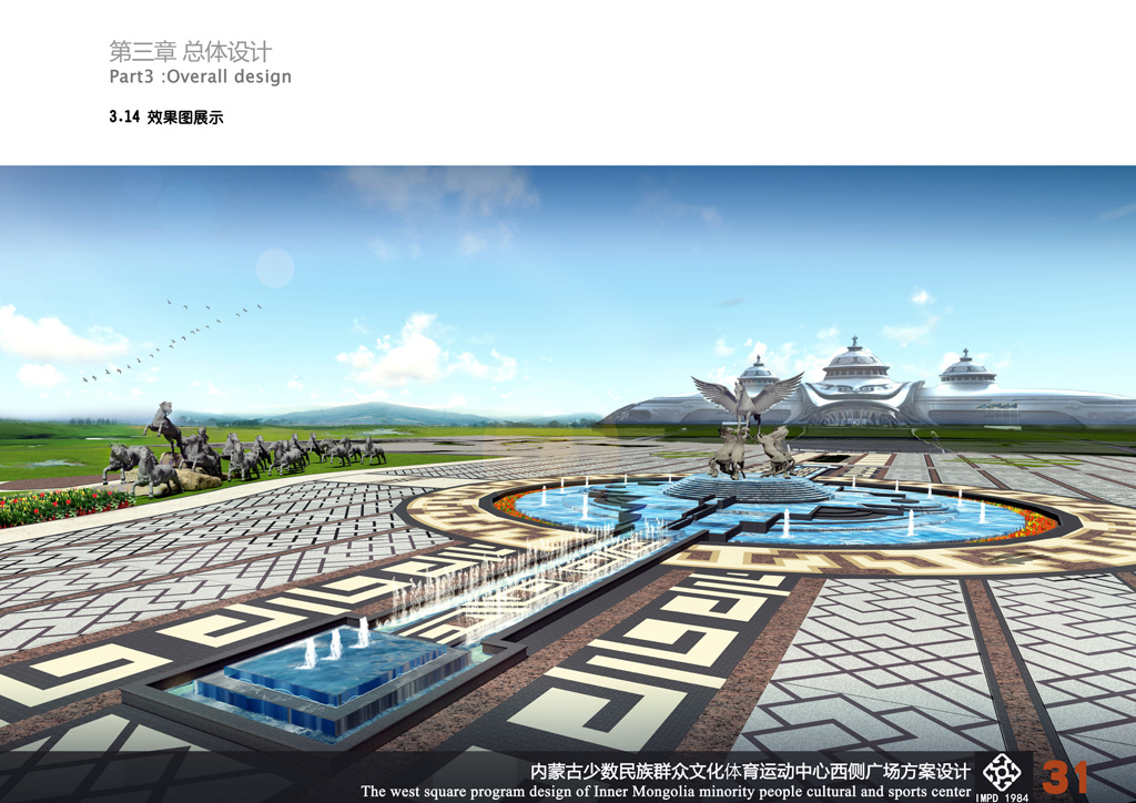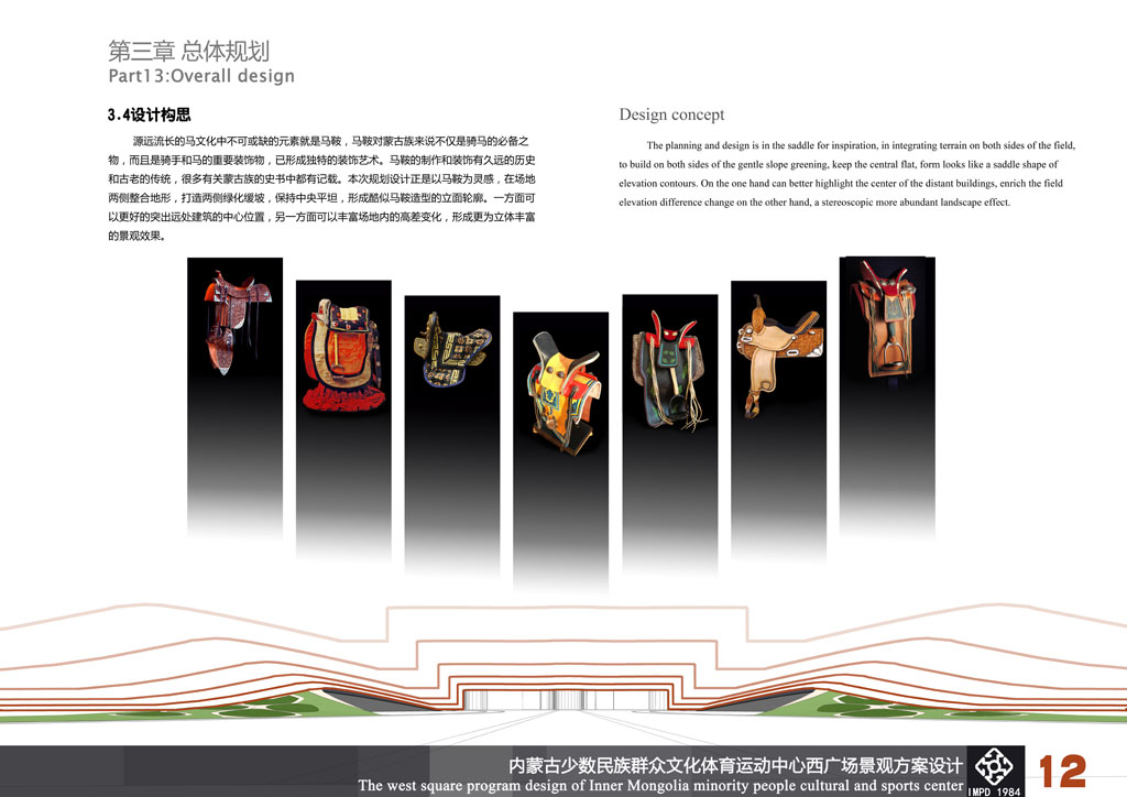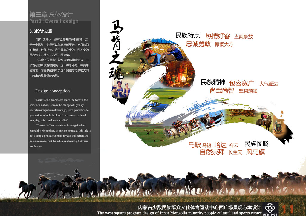 設計《馬背之魂》的靈感來(lái)源于馬鞍,馬鞍被草原人民譽(yù)為孕育民族搖籃的吉祥物。整個(gè)廣場(chǎng)景觀(guān)被設計為馬鞍型,場(chǎng)地兩側和中央入口景觀(guān)軸是鞍橋、鞍墊、夾墊、鞍韂和腳蹬,展示出草原“馬背之魂”的氣勢和氣魄,寓意自治區及全區人民吉祥如意。同時(shí),場(chǎng)地入口處設計了馬頭琴造型,兩側是哈達及迎賓歌舞等雕塑,表達出草原人民熱情好客的情懷;會(huì )場(chǎng)周邊是“馬圖騰” 和“萬(wàn)馬奔騰”群雕,進(jìn)一步突出蒙古族豐富多彩的“馬文化”。