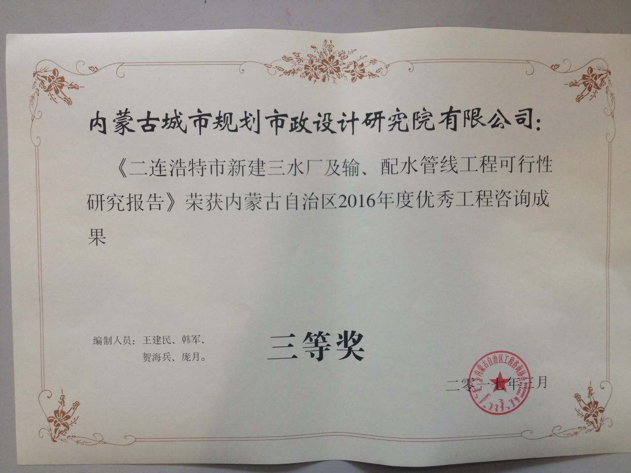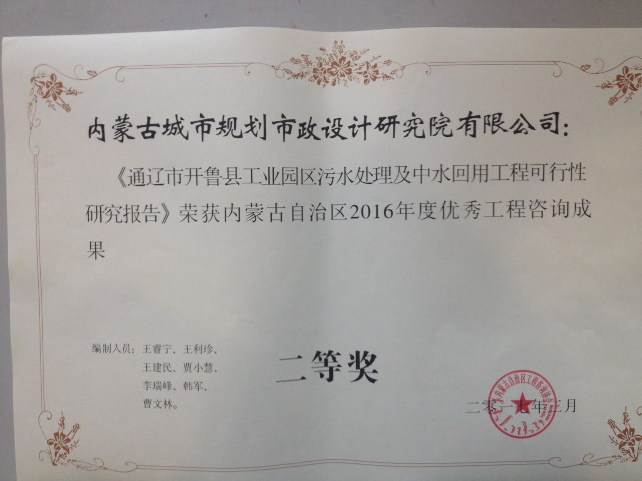 自治區2016年度優(yōu)秀咨詢(xún)成果獎名單揭曉,我院市政一所設計的《通遼市開(kāi)魯縣工業(yè)園區污水處理及中水回用工程》、《二連浩特市新建三水廠(chǎng)及輸、配水管線(xiàn)工程可行性研究報告》分別榮獲內蒙古自治區優(yōu)秀工程咨成果二、三等獎。