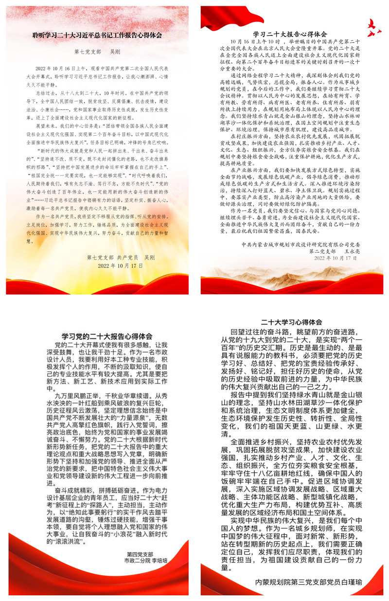 疫情雖然阻擋了大家的腳步,但是阻擋不了各位黨員同志收看的熱情。收聽(tīng)收看過(guò)程中,內蒙古規劃院黨員干部聚精會(huì )神地聆聽(tīng)習近平總書(shū)記重要講話(huà),倍受鼓舞、倍感振奮、倍增信心,不時(shí)用筆記下報告中的金句。大家紛紛表示,習近平總書(shū)記所作的大會(huì )報告凝聚人心、催人奮進(jìn),尤其是涉及到增進(jìn)民生福祉,提高人民生活品質(zhì)方面,提出的一系列舉措,讓我們對今后的工作和生活更有盼頭;涉及到推動(dòng)綠色發(fā)展,促進(jìn)人與自然和諧共生,推進(jìn)生態(tài)優(yōu)先、節約集約、綠色低碳發(fā)展方面,與我們的工作息息相關(guān),作為新時(shí)代設計師,我們要在清潔能源、生態(tài)修復、低碳建筑等方面大膽創(chuàng )新、銳意進(jìn)取,為建設亮麗內蒙古貢獻專(zhuān)業(yè)力量。我們將以此為契機,學(xué)深悟透習近平總書(shū)記重要講話(huà)精神,要繼續堅定不移跟黨走。作為一名黨員技術(shù)人員,要在做好本職工作的同時(shí),不斷加強學(xué)習,提升專(zhuān)業(yè)技術(shù)能力和科研水平,為推動(dòng)全院各項工作再上新臺階貢獻力量。