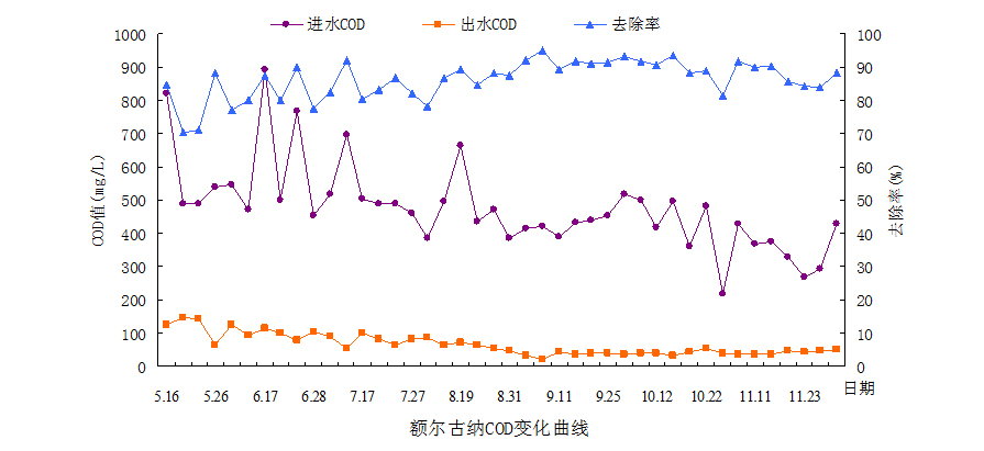 上圖顯示調試期間COD的變化趨勢以及去除率變化曲線(xiàn),污泥馴化結束后15天時(shí)間內,COD去除率可達到70%以上。經(jīng)過(guò)近3個(gè)月的調整,自8月中下旬起出水COD值維持在60mg/L以下,平均去除率穩定在89%以上并持續保持良好穩定的去除效果。