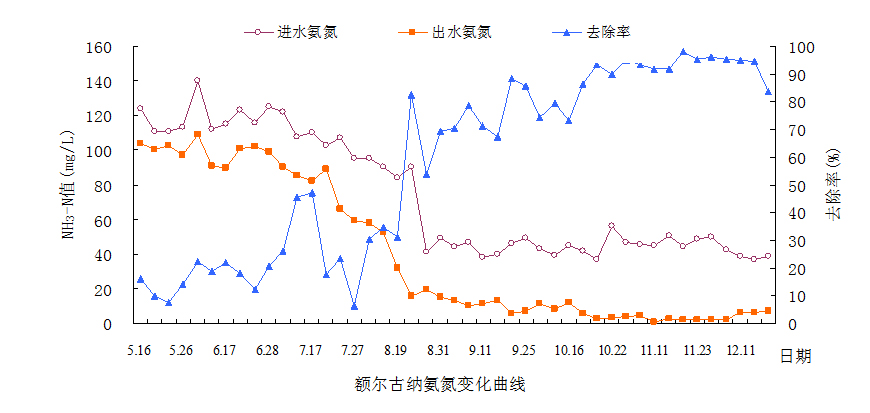 5月開(kāi)始調試污染物去除效果的變化曲線(xiàn)如下: