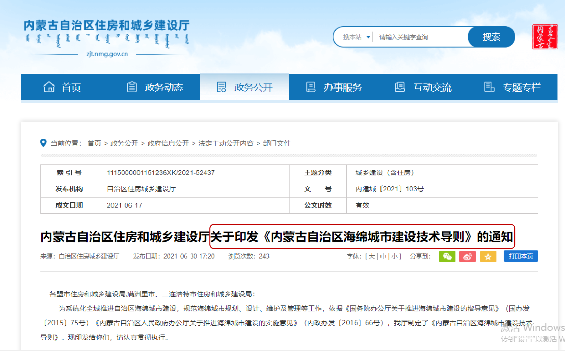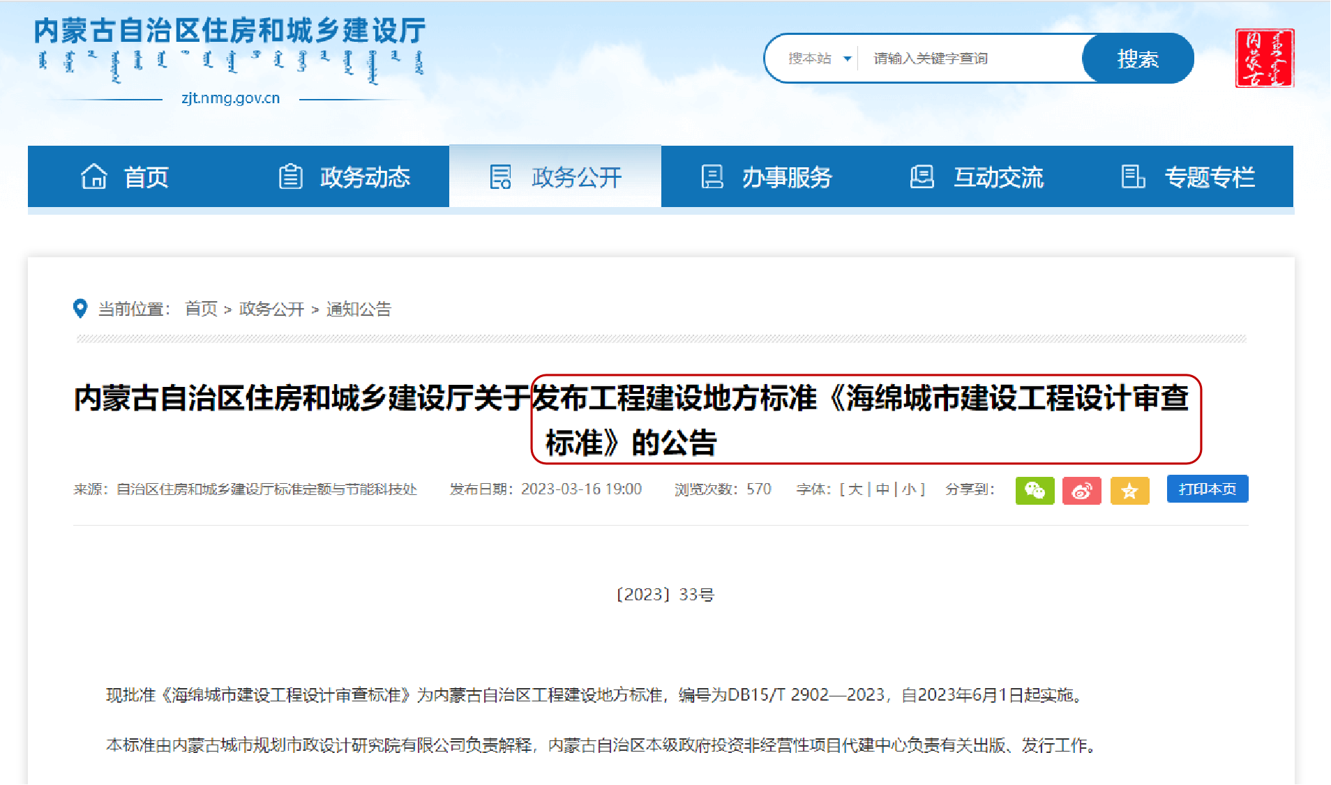 我院主編的地方標準《內蒙古自治區海綿城市建設工程設計審查標準》近日印發(fā)